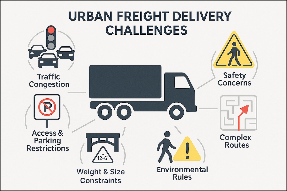 The biggest ones include traffic congestion, access restrictions, regulatory complexity, high costs, and lack of visibility. For large freight, you also have to consider maneuverability, delivery site readiness, and the need for special equipment or handling protocols.